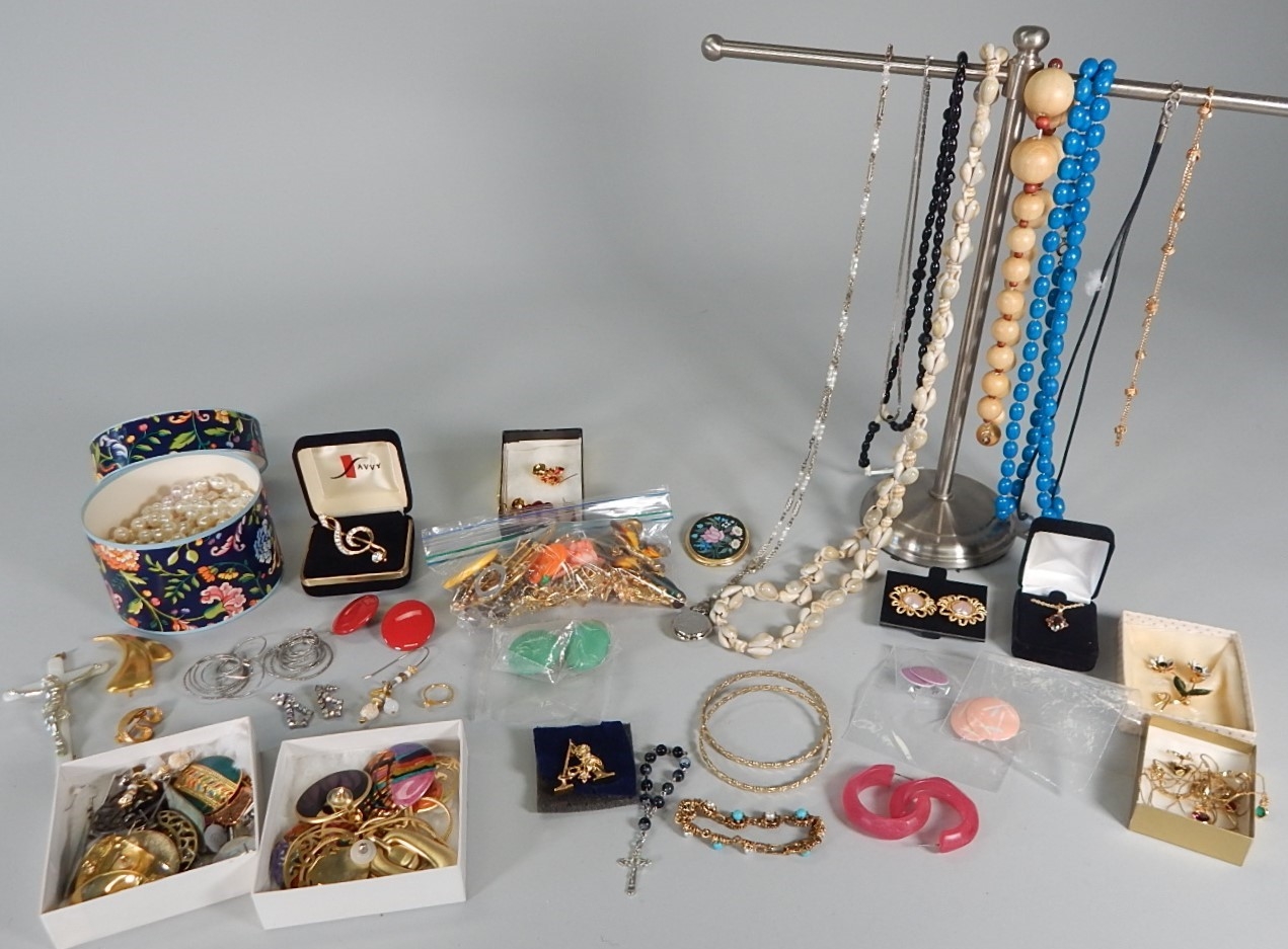 Necklaces, pins, pendants, and earrings.