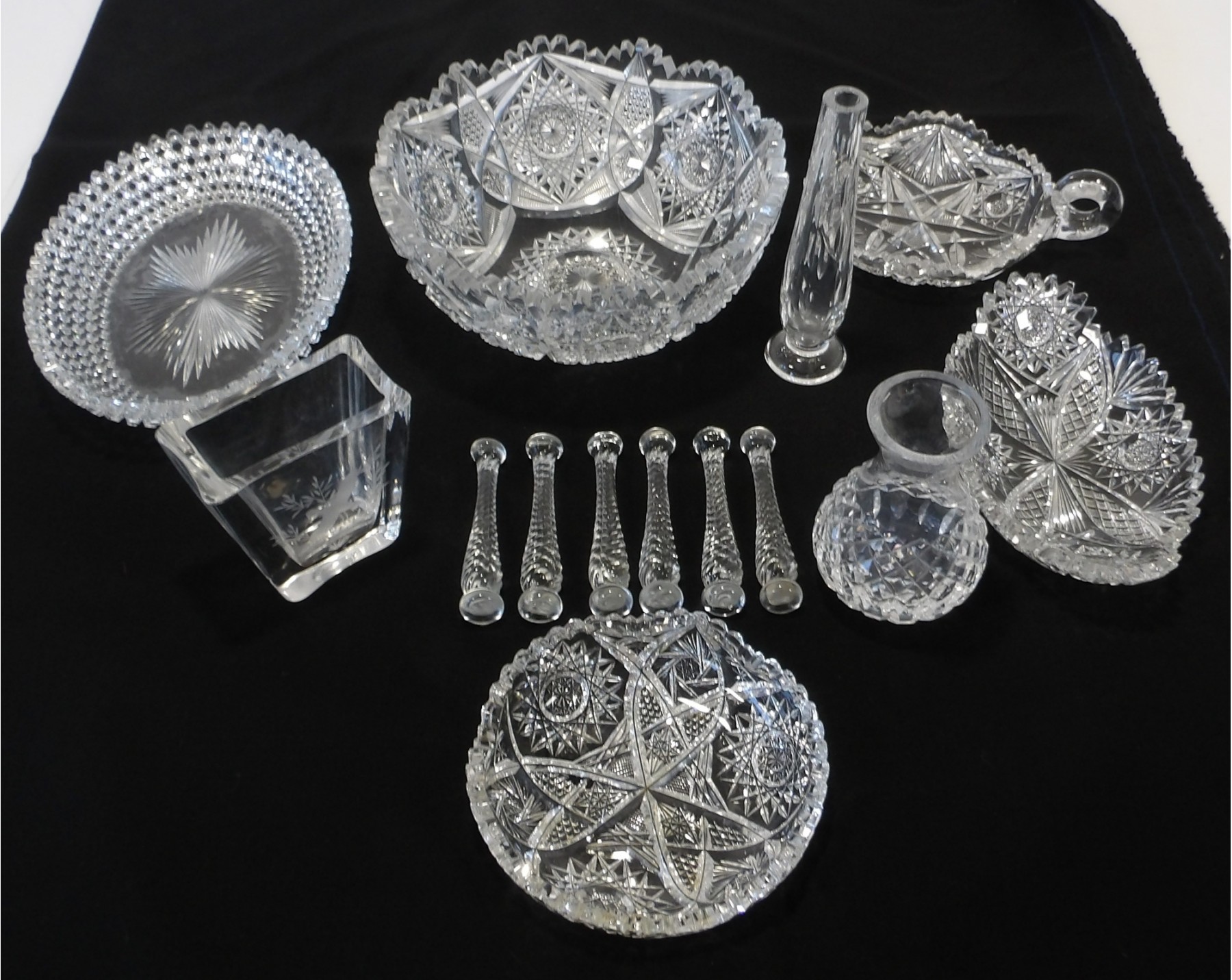This lot contains 5 beautiful cut glass pieces. 6 glass knife rests.