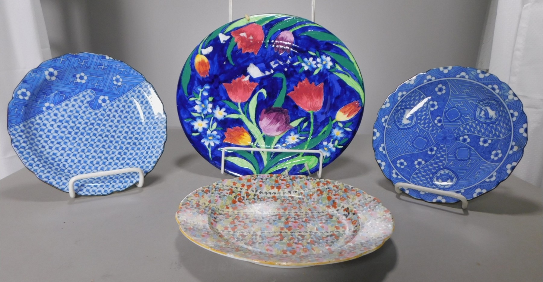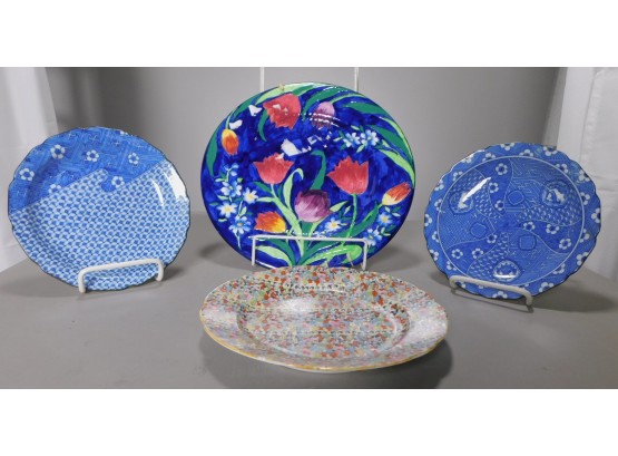 Large plate is Maling, Newcastle on Tyne, England. 11 1/4". Hand painted. Bright colored tulips. Ready for hanging. No chips, or cracks.