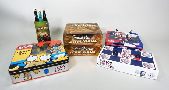 Simpsons chess set; 2 Trivial Pursuit Star Wars games; Boston Red Sox checkers & chess sets. Condition is very good. See photos for details.