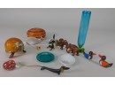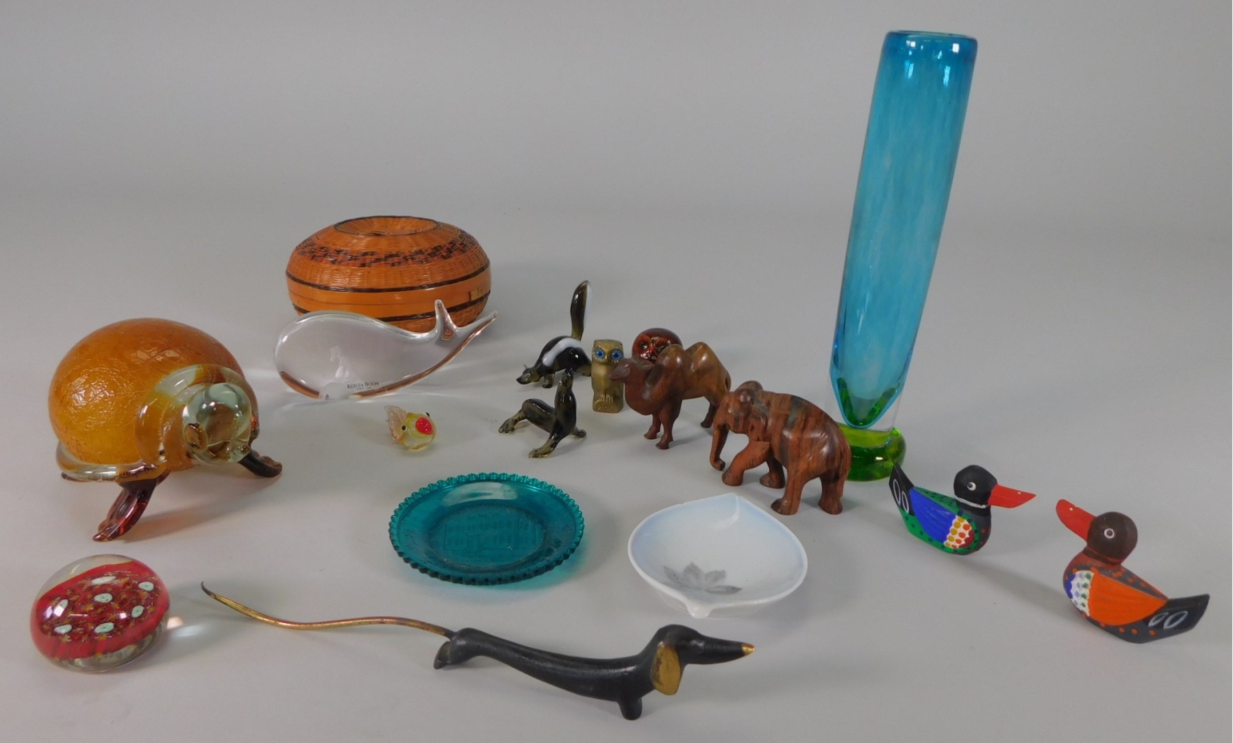 Kosta Boda "Jonas and the Whale". Signed by V. Lindstrand. A small paperweight by Murano. A small brass owl. A signed, hand blown vase. The dachshund is cast iron. Other items as shown.