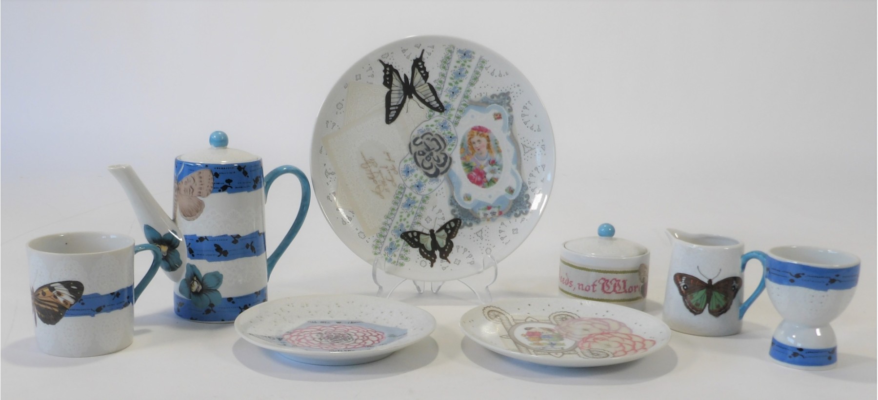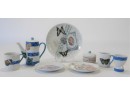 3 plates, sugar and creamer, teapot and mug, and an egg cup.