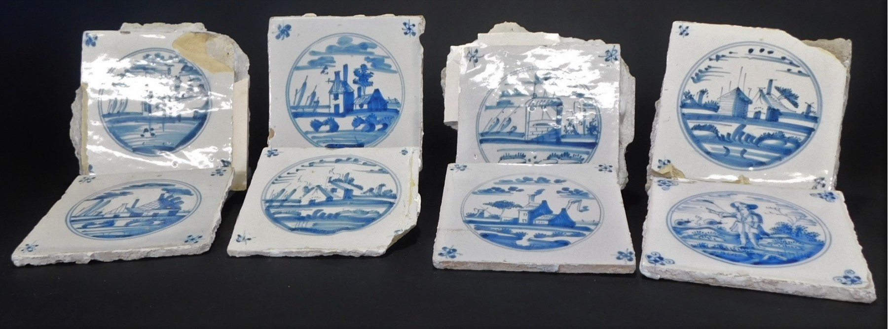 Mid 18th century dutch tiles. 5" x 5". Some have the plaster stuck to the back. 8 pieces in this lot.