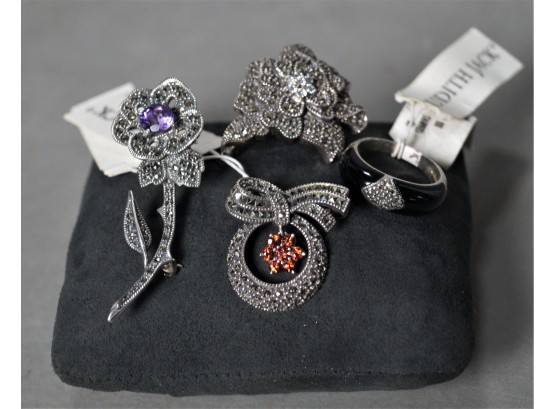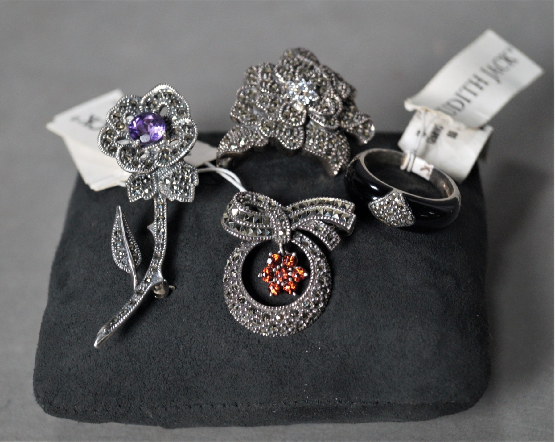 Listed are 4 Judith Jack sterling and marcasite pieces as follows: A floral brooch with an amethyst center, a polished black onyx ring size 8, a ribbon brooch with floral dangle charm of orange zircon (?), and a solid marcasite floral brooch. All have original tags and are in great condition.