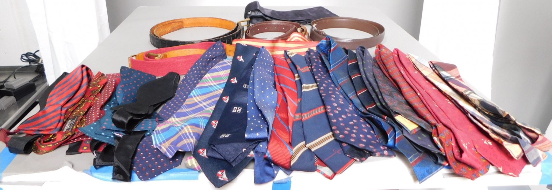 If you are a tie guy, this lot is for you. The belts are size 36. Several bowties. Ties are Brooks Brothers, Thompson Forbes, Jim Thompson, and some unbranded.
