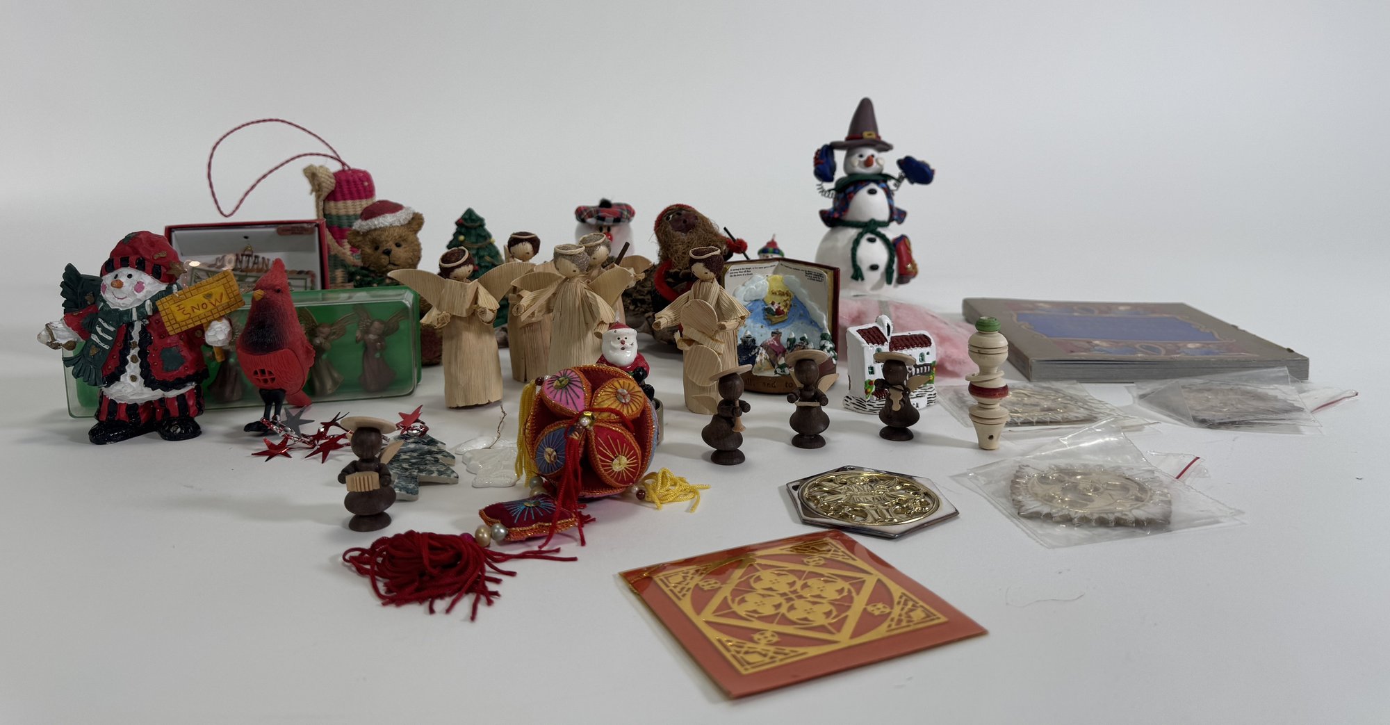 Collection of miniature Christmas ornaments and decorations. Includes various figurines, a snowman, small trees, and other festive items. Also includes a book and other small accessories. The lot is presented as shown in the images.