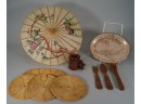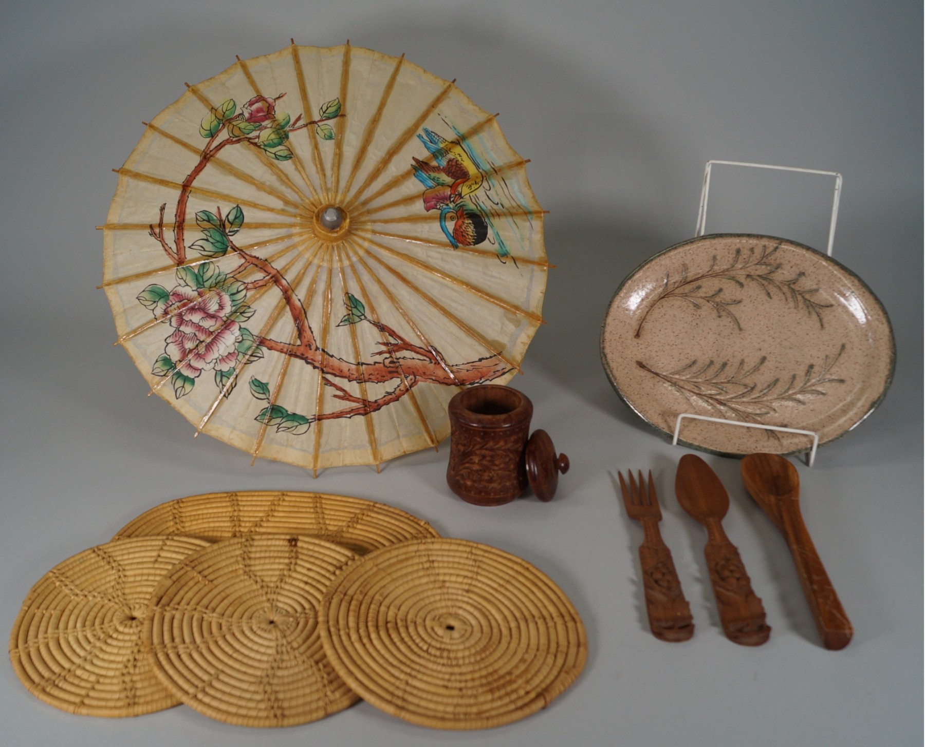 Wood utensils, wicker hot plates, and decorative umbrella.
