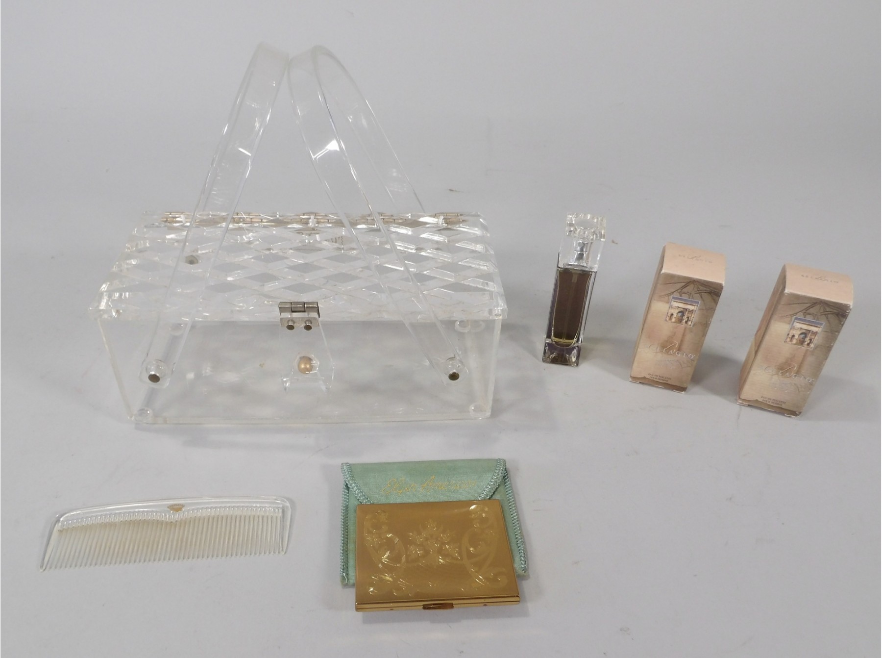Patricia of Miami Lucite purse. Comes with a beautiful vintage Elgin American compact with case. 2 small bottles of Bellagio Uomo for men. 1 small bottle Elizabeth Arden eau de parfum. Lastly, your own plastic comb.