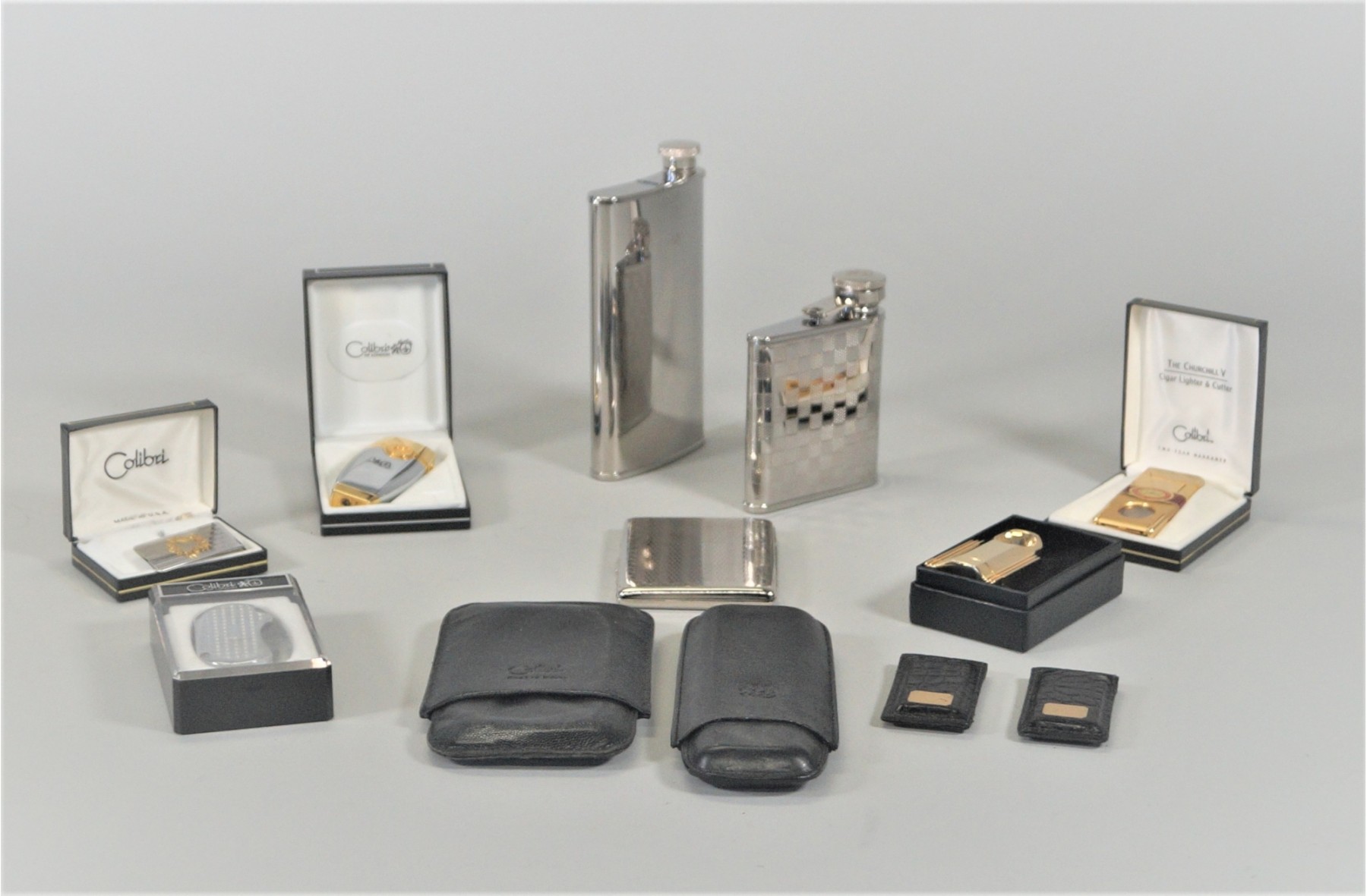 Miscellaneous items include: Two flasks, two cigar holders, 2 leather money clips , one Silverstone cigarette holder, 2 Colibri lighters and one Colibri metal money clip.