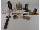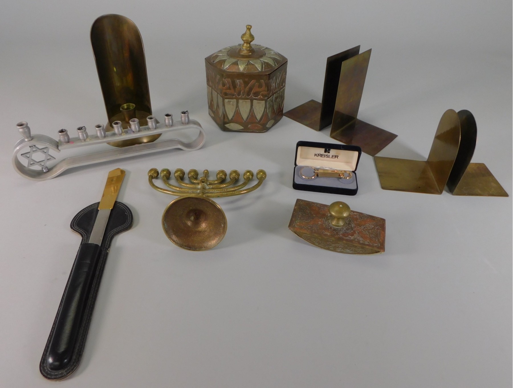 This lot includes 2 menorahs. 2 pair handmade brass bookends. A rocker ink blotter. Metal taper candle holder. Metal box with cover. Key chain. Letter opener.