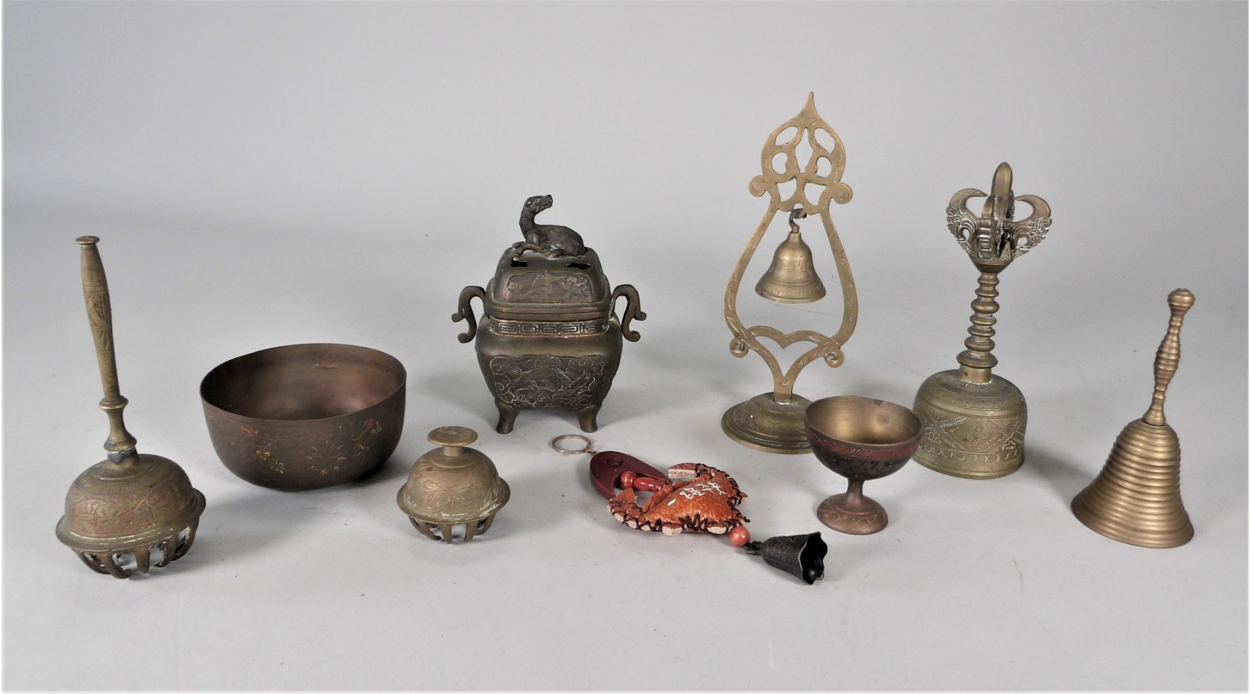 Listed are 8 brass pieces and a decorative key chain. There are 5 bells of various sizes and decorative effects. There is an incense burner with dog-topped lid - approx. 6"h; a small bowl 4.25"dia x 2"h; a small cup with nice incised decoration 2.25"h x 2.25"dia. Also listed is a keychain with a leather crab, and bell. Condition is very good on all items in this lot. See photos for details.