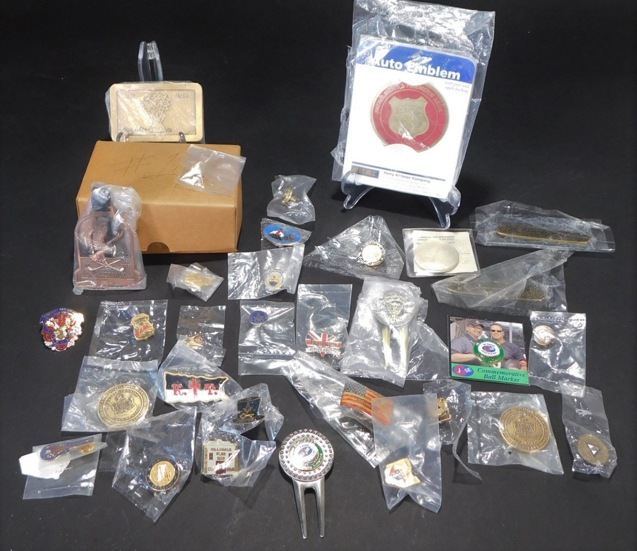 Among all the pins, there is a belt buckle, a bag tag, and an auto emblem. A little bit of everything. There is a box full of pins that say #1.