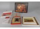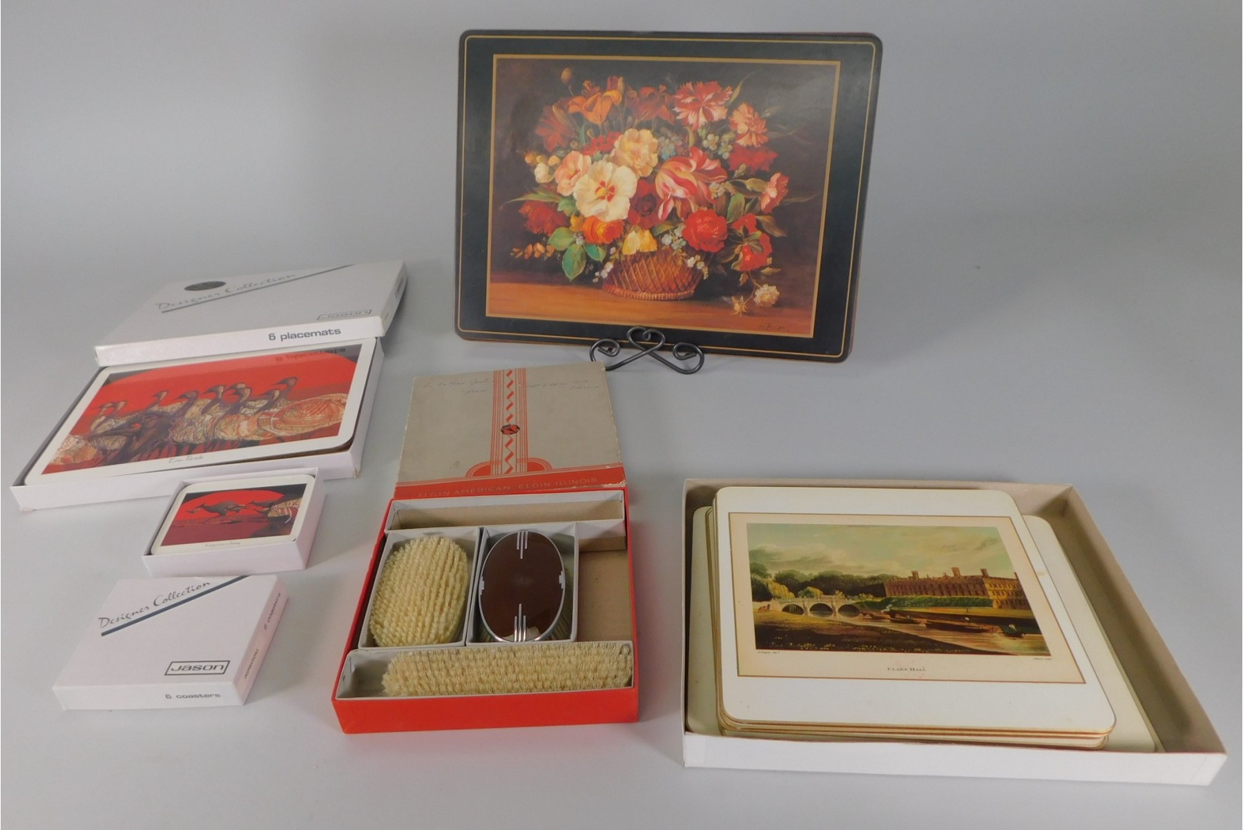 Several decorative, cork backed placemats, and coasters. Some are by Jason. There is also a box with 3 shoe brushes, made by Elgin.