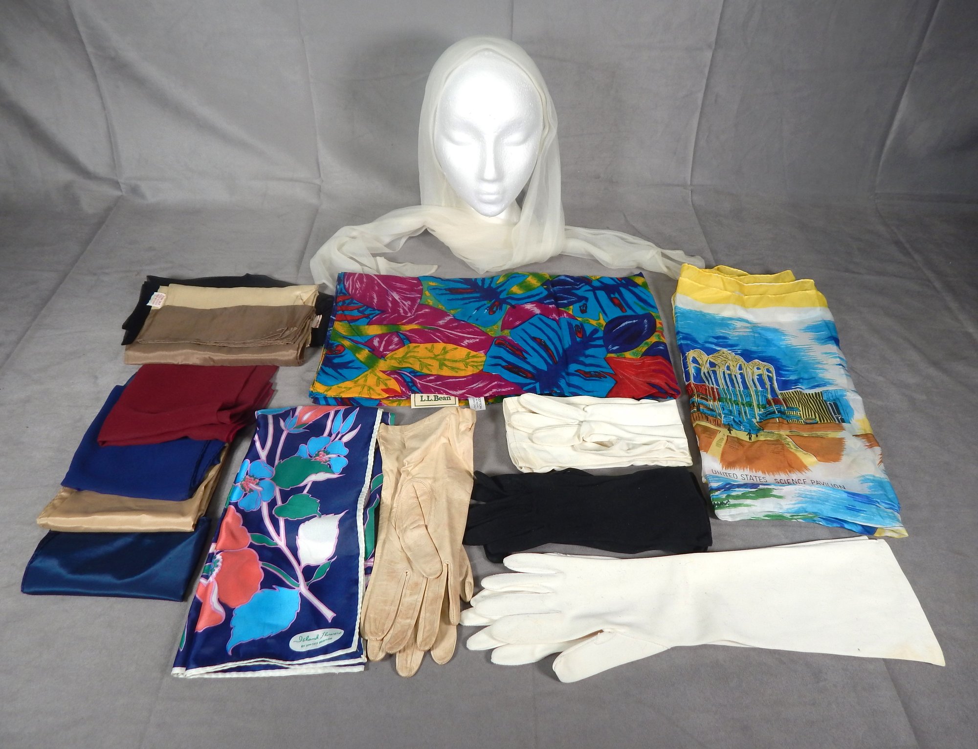 Variety of scarves - silk, poly, cotton. Gloves are cotton & leather. Condition is good.