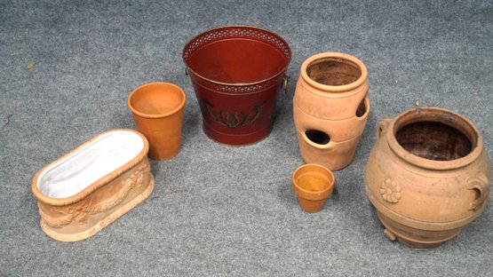 1 Tole planter and 5 terracotta planters.
