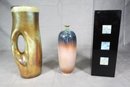 Blue/pink/brown bud vase - illegible marking on bottom. Measures 9"tall. Small chip on underside of top rim as seen in attached photos.