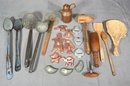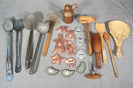 Two wooden spoons, a pestle, a mallet and a straw sieve, and a cork pull