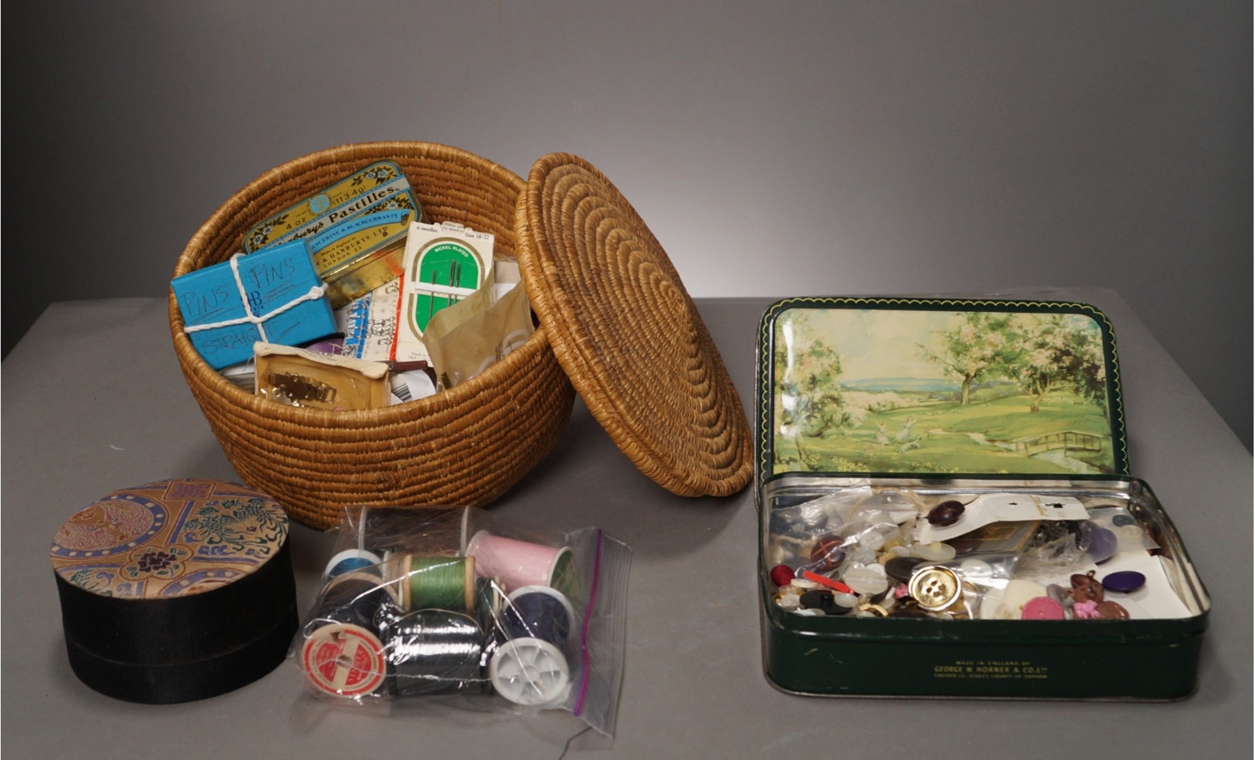 Listed is a sewing basket filled with thread, pins, buttons, notions, etc., a decorative tin box of buttons and an empty round silk box with decorative lid. All in good condition.
