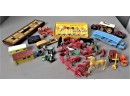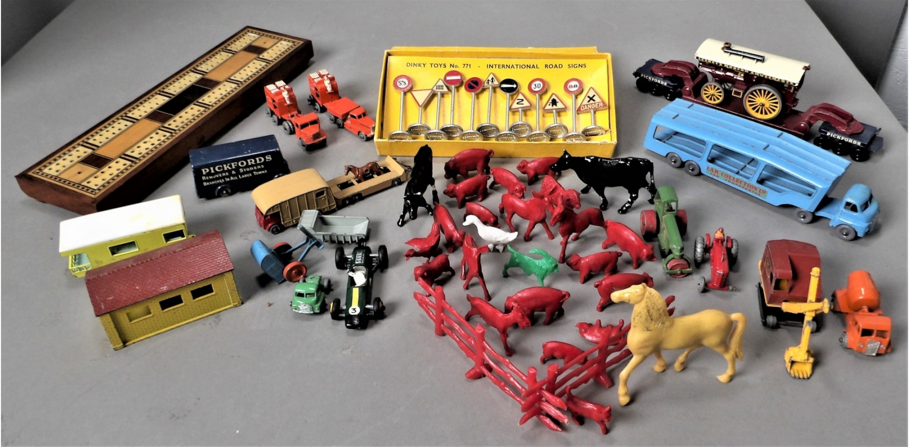 Listed are a number of vintage toys - plastic farm animals, metal farm vehicles, cribbage board (pegs are missing) set of miniature road signs, various "Matchbox" Made In England by Lesney cars & trucks. These toys are in great condition for their age. See photos for details.