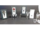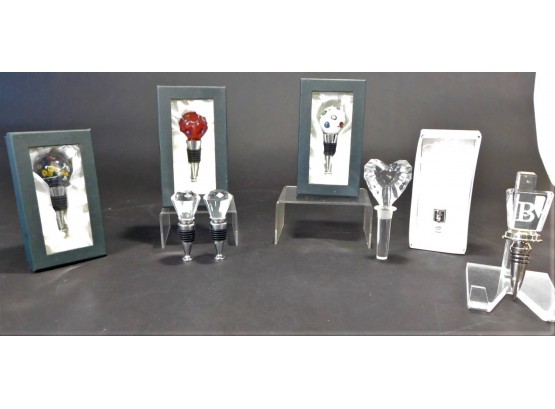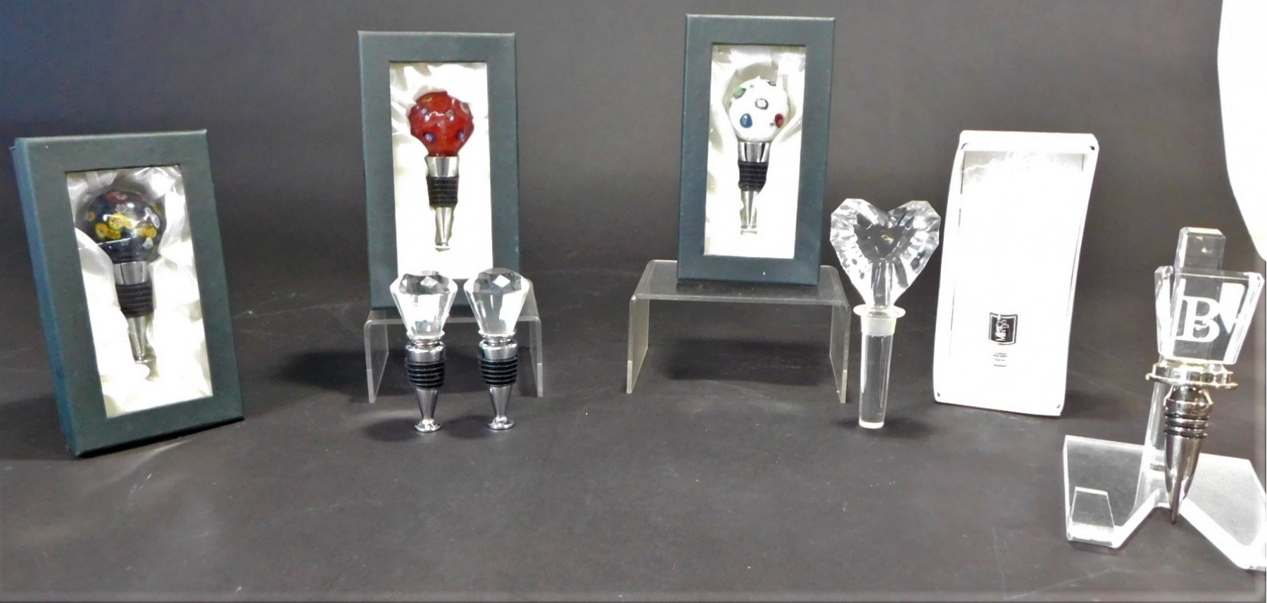 Nice lot of bottle stoppers. 3 are colorful. 4 are clear, heavy glass. Mikasa stopper is a bunch of grape leaves.