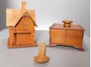 Wooden house comes apart in 3 pieces. Could be used as a jewelry box. It is signed on the bottom, as shown. The square box opens the drawers with a twist of the top. The drawers close when you move one of them to the side. Also, a decorative spoon.
