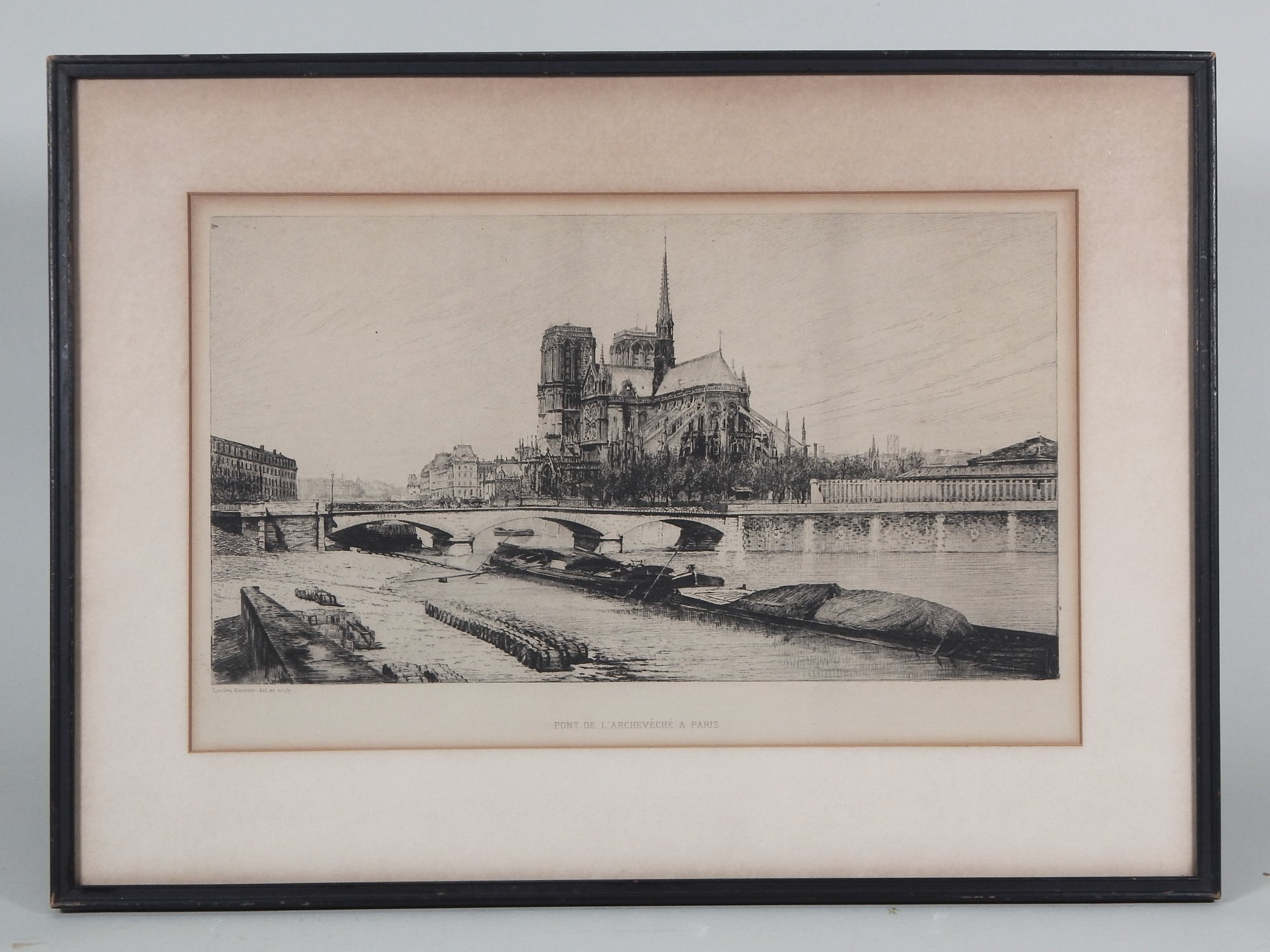 An antique engraving of Notre Dame cathedral in central Paris, viewed from the south bank of the Seine river, titled at bottom "Pont de l'Archeveche Paris", artist name K. Gautier (LUCIEN GAUTIER, 1850-1925) at lower left margin. The print measures 9.75" x 14 75", overall 14" x 19".