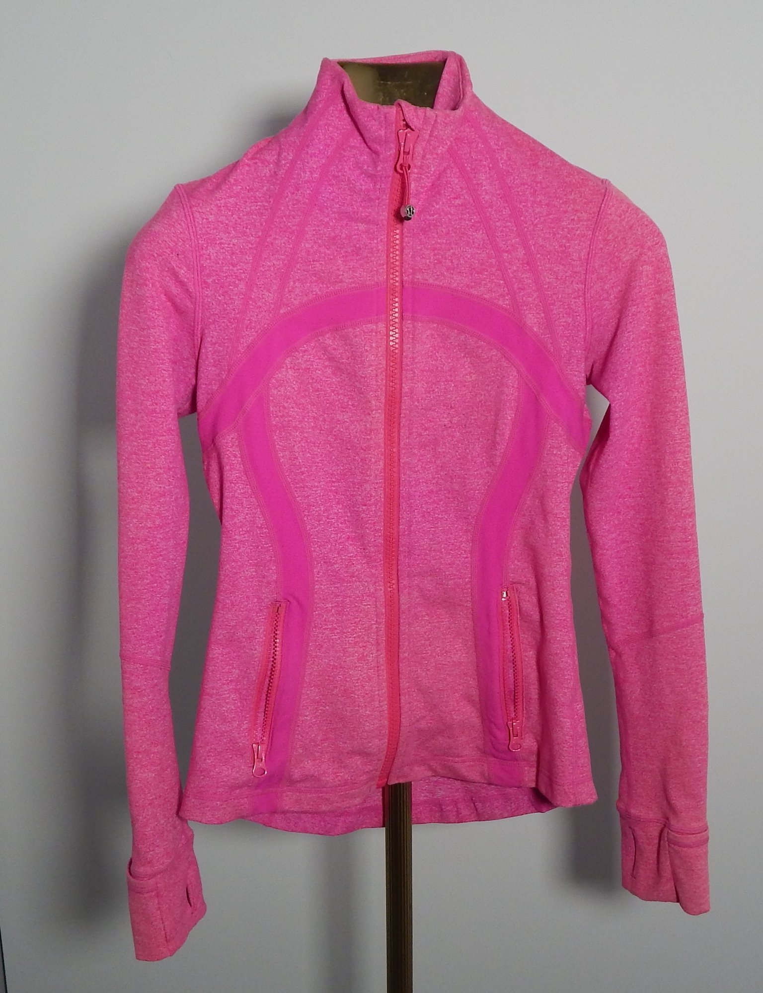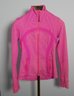 Hot pink zip us jacket mad by Lululemon. The zippers have the Lululemon symbol. 2 zip pockets. Armpit to armpit is 16". Good condition. Needs a cleaning.