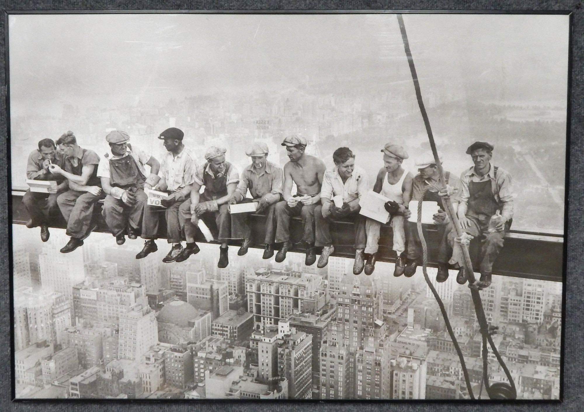 Large print in black metal frame of "Lunch Atop A Skyscraper", an iconic photograph taken in 1932 of eleven workers on a steel beam 850 feet above the ground on the 69th floor of the RCA Building during the construction of Rockefeller Center.