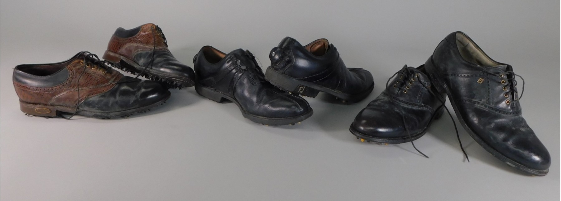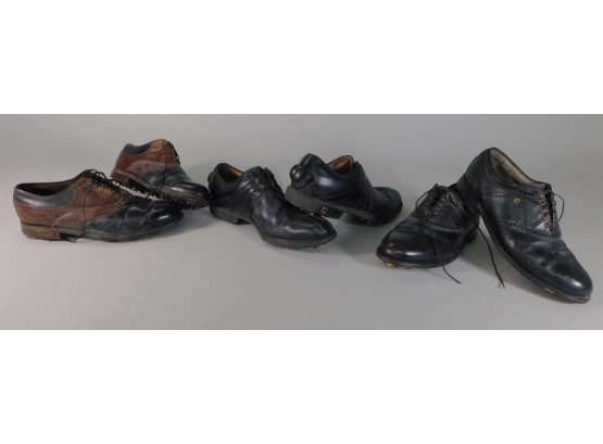 3 pair of shoes. The Footjoy Opti Flex are size 11M. The other 2 pair are 10 1/2. These shoes have been worn. Cleats are in good condition.