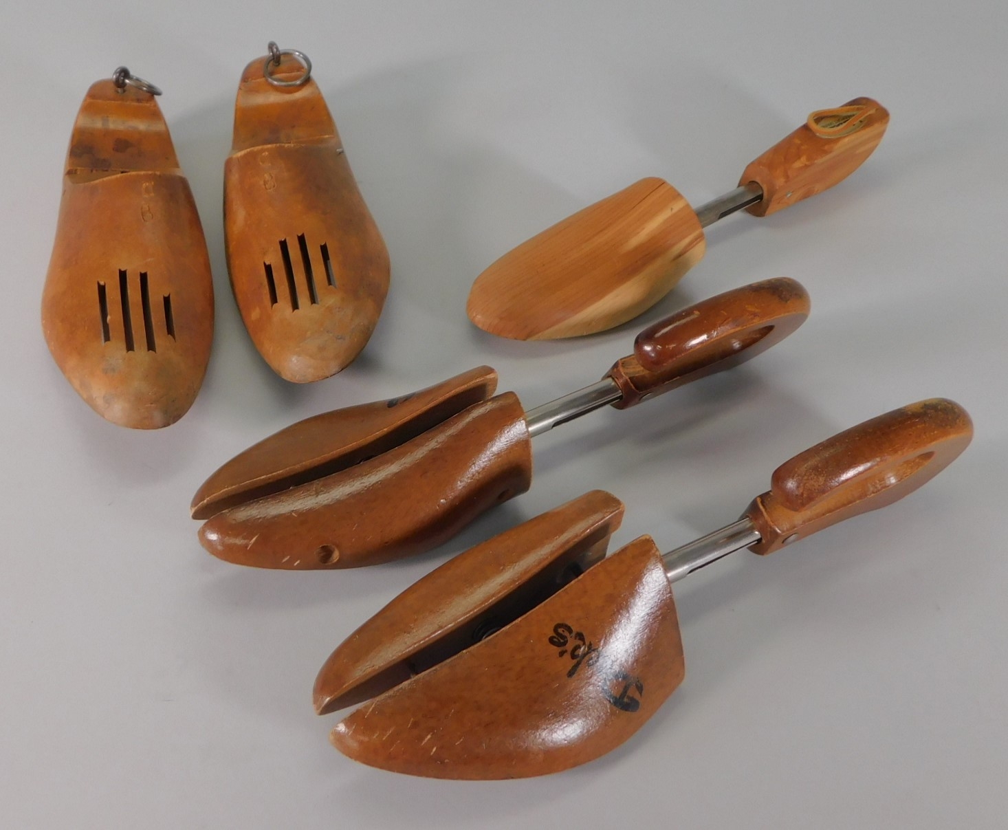 One pair is Dack's for size 8-9. Made in Germany. The pair with the 4 vents is 11" long. The single form is LL Bean. Cedar.