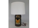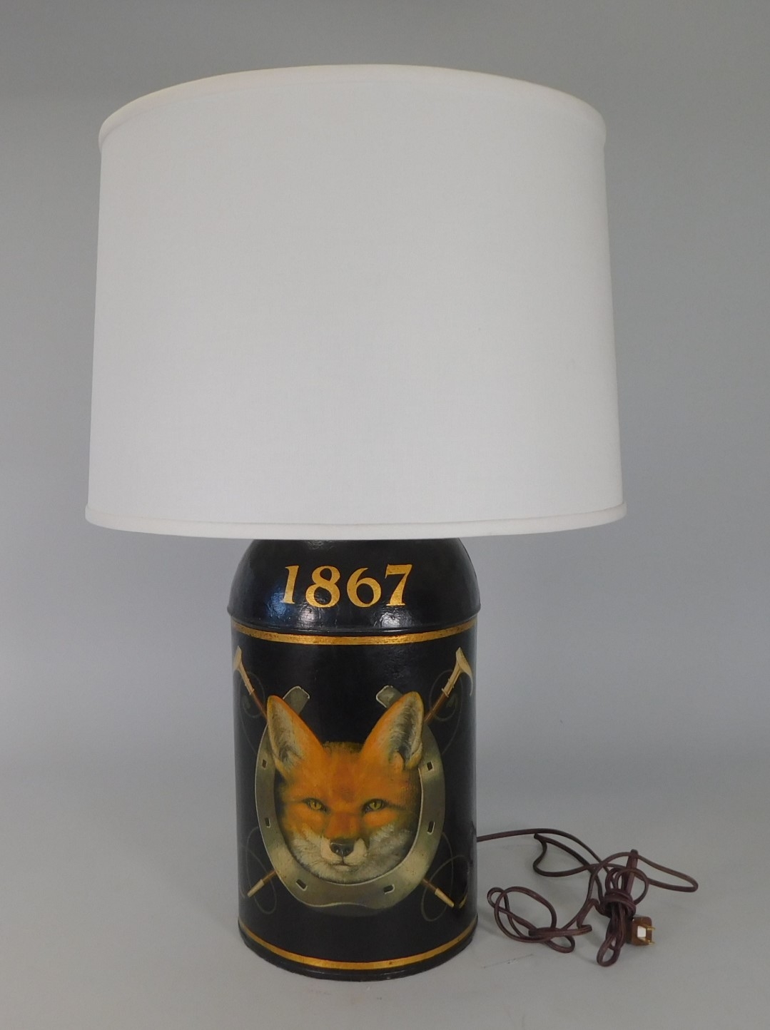 This metal lamp is black. 2 light bulbs, each with their own chain. Or you can use the switch on the cord. The lamp itself is 18" tall. the lamp shade is 16" in diameter. The cord is a bit frayed, as shown. It does work.