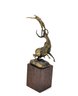 Modern Brutalist bronze sculpture of a charging longhorn or bull in motion, with a nude woman acrobat balancing on its horns, on a wooden base, incised with signature and edition number on side of bronze base.