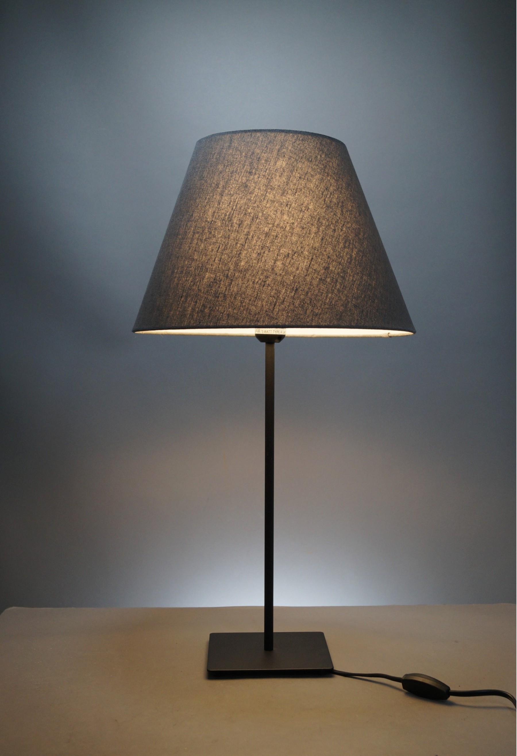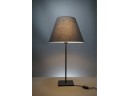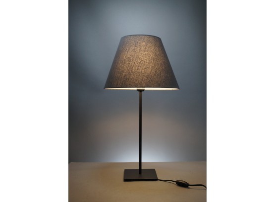 Listed is a simple black metal table lamp with a dark grey linen shade. I has a hand on-off switch on the cord. It measures 25"h to top of shade, base is 6" square. In working order and in very good condition.