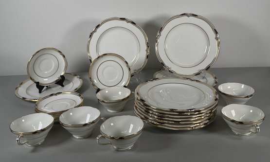 Vintage Minton's fine china set, made in England. White with gold trim. Includes 6 tea cups and 5.5" saucers and eleven 9" plates.