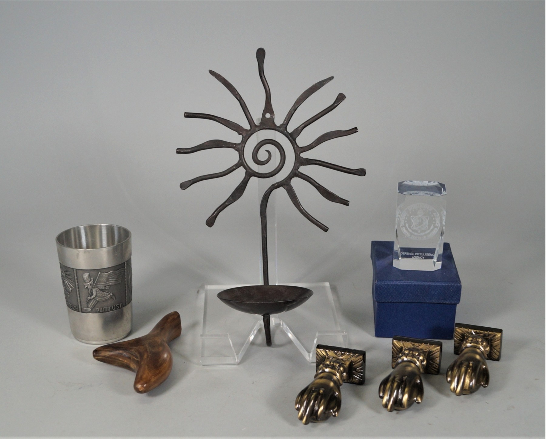 Listed are as follows: 3 reproduction Victorian ball-in-hand doorknockers. The back plates measure 1.25" x 1.75" and the length is 4.25". All hardware included. A USA Defense Intelligence Agency commemorative crystal paperweight in original presentation box. It measures 3"h x 2" square. An unidentified piece of very smooth wood in an organic shape, about 5" long, a 1980 Puma commemorative cup in pewter, and a wrought iron sunburst candle sconce, 11"h.