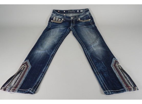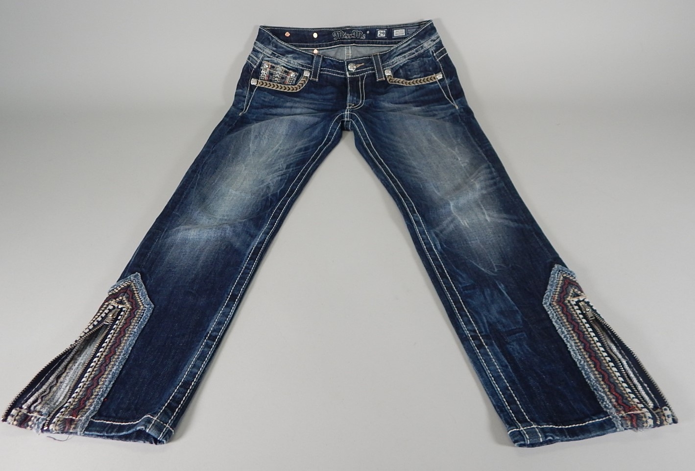 Women's jeans size 29 mid-rise ankle skinny. These jeans are embroidered on the pockets and bottom of legs. Also, zippers on the legs. Inseam is 27. Color is dark 419. Machine wash.