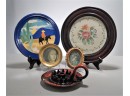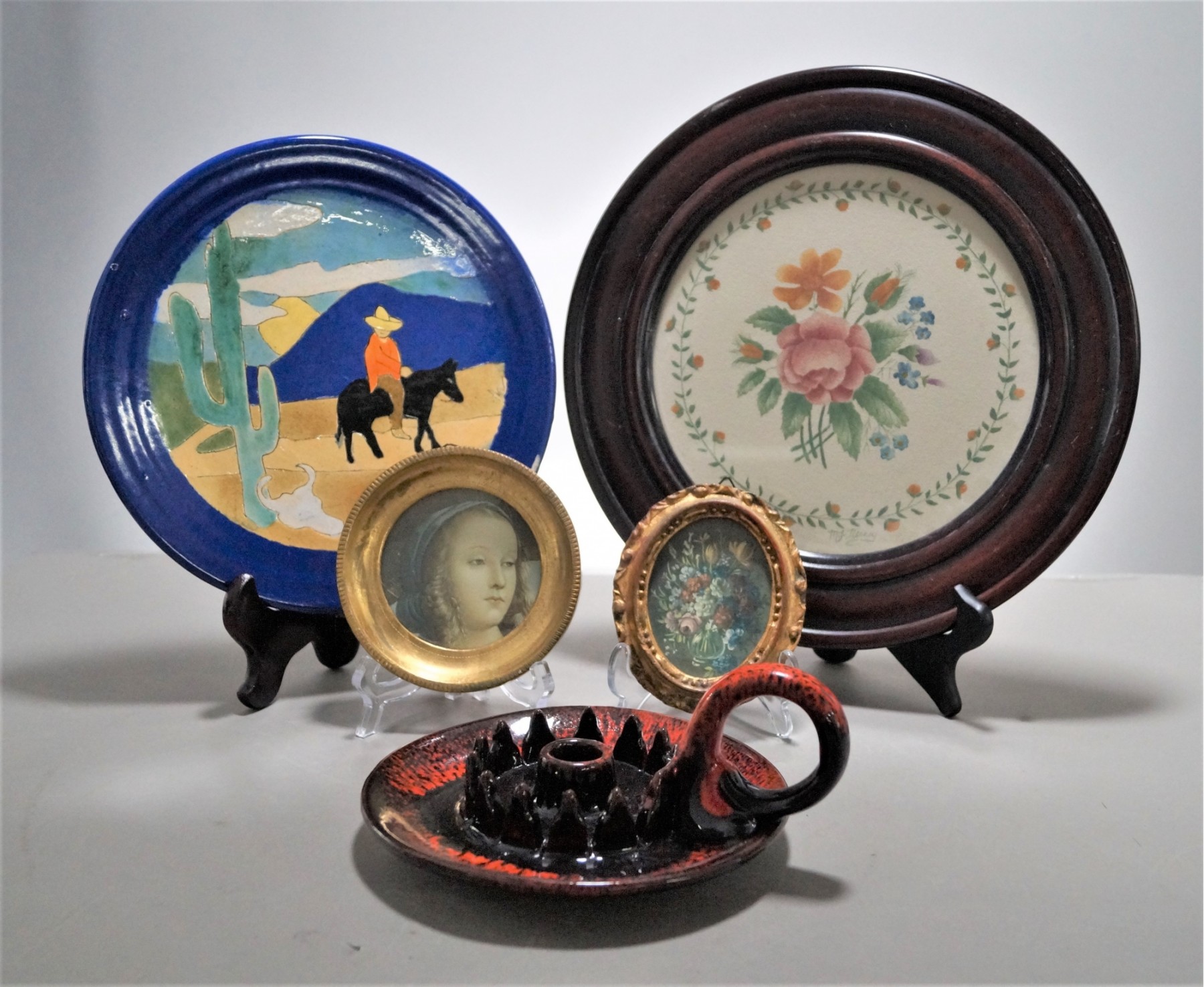 Listed are as follows: A hand made ceramic plate with Southwest motif, 9.5" diameter, a round wood frame with floral print on cream velvet, a little oval Italian frame with floral print, 4.5" x 4", a little round Italian frame with portrait, 4.5" diameter, a red and black Evangeline Canada art pottery candle holder, 7.5" diameter. All in very good condition, please see photos for details. Plate has a white fingerprint near rim that appears to be part of the manufacturing process.