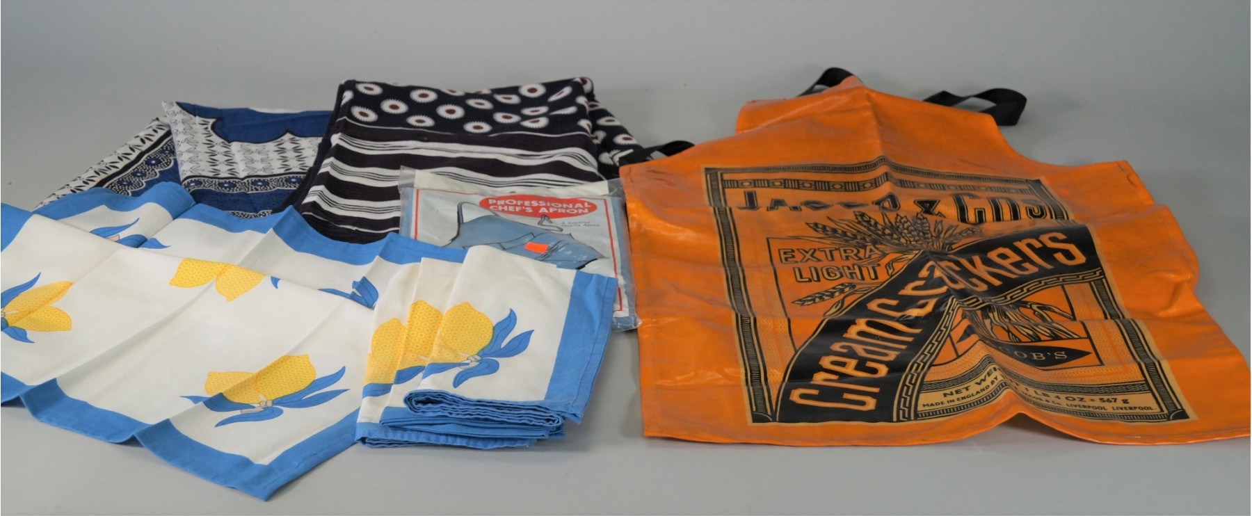Listed are the following: an orange Jacob & Co. cotton PVC laminated apron, four never-used Couleur Nature Paris 100% cotton 20" x 20" napkins with lemon motif and blue border, two African cotton tablecloths with lively designs measuring 42" x 60" each (one has a small tear repair) and an Excello 100% cotton professional chef's apron in light blue in original packaging. All in very good condition. See photos.