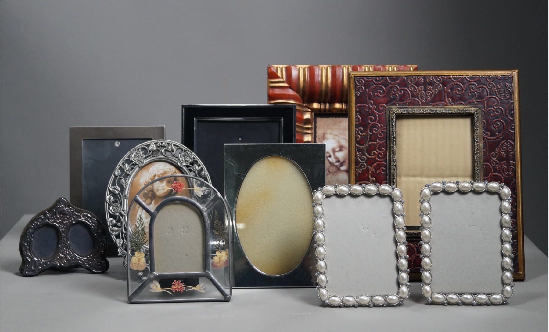 Listed are 10 tabletop picture frames in a variety of shapes and sizes. For scale, the largest frame measures 8" x 10". In good used condition.
