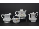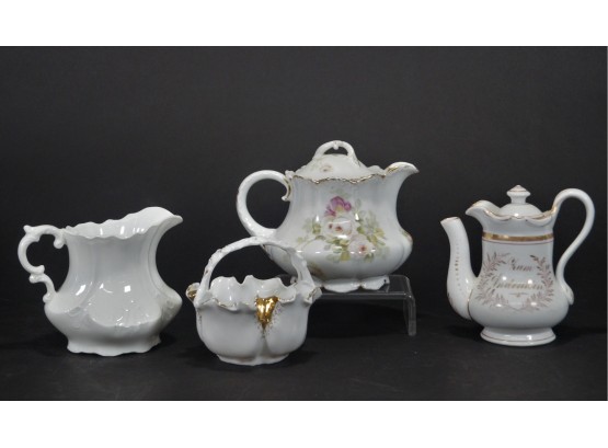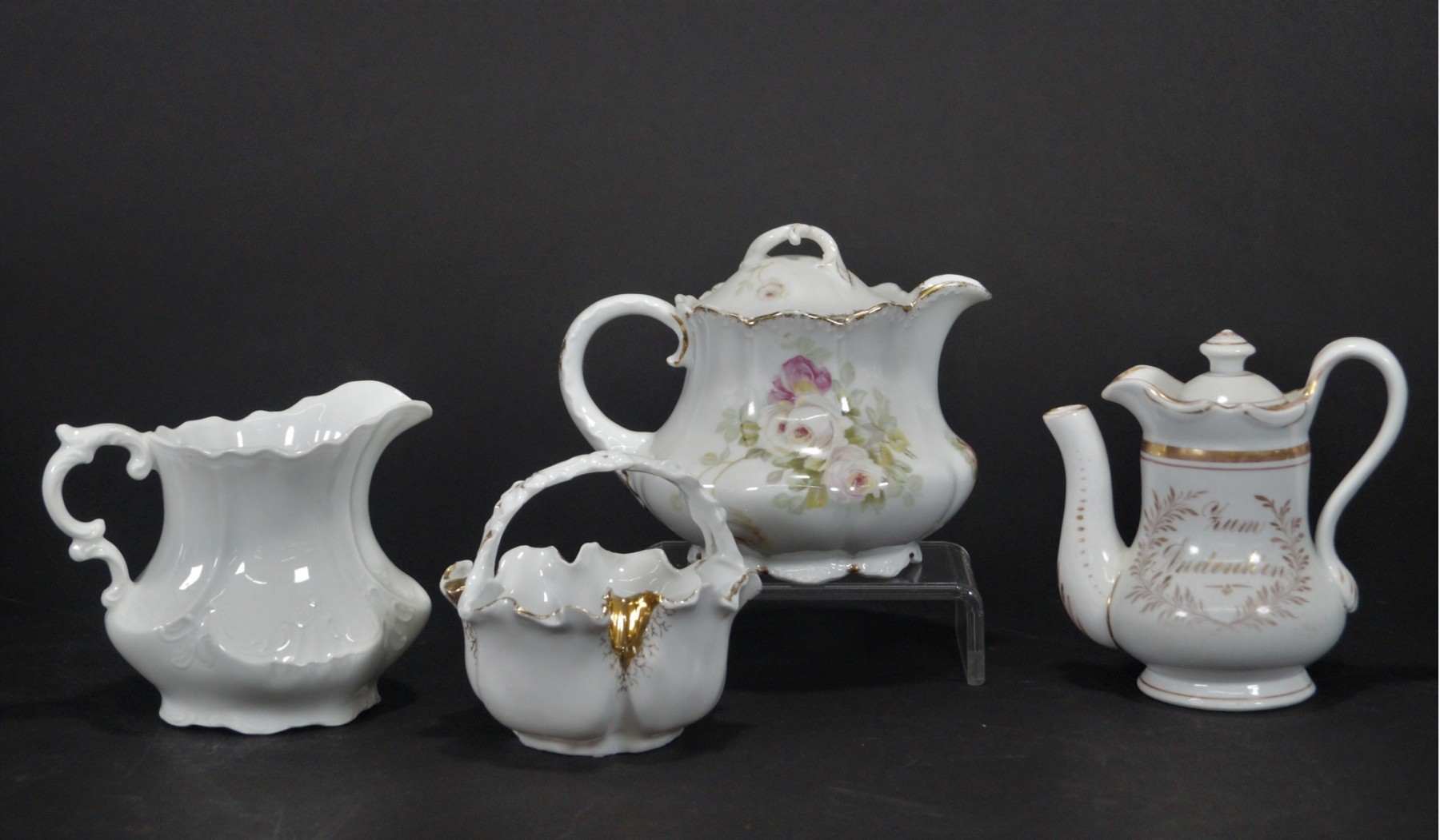 Listed are the following 4 pieces: a sweet little single serving teapot with the German words "Zum Andenken" which means "for souvenir" in pink and gold, unmarked, a Malmaison teapot with pink rose decoration, marked, a white creamer, unmarked, and a white and gold sugar or candy dish. The little single serving teapot has chipping on the lid. All others in very good vintage condition. See photos.