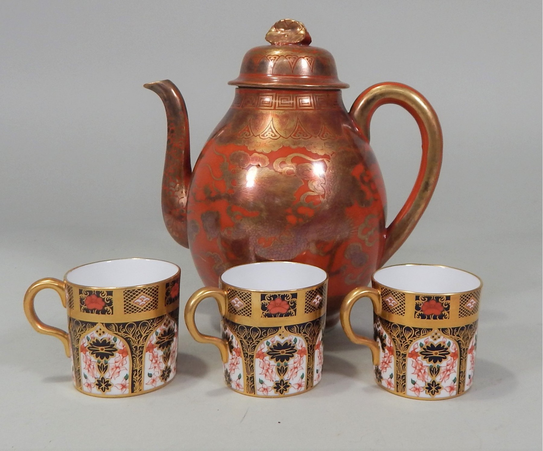 Listed is a lovely Japanese eggshell porcelain teapot, orange with gold dragon decoration. The porcelain is so fine it is transparent. Also listed are three Royal Crown Derby English bone china demitasse cups, no saucers. All in very good condition with no chips or cracks. See photos for details.