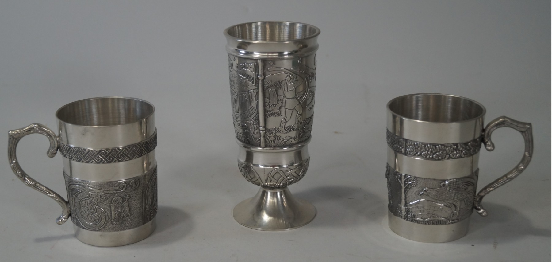 3 beautiful pewter cups made in Ireland. 2 are tankard style with handles. One is taller without a handle. Great condition.
