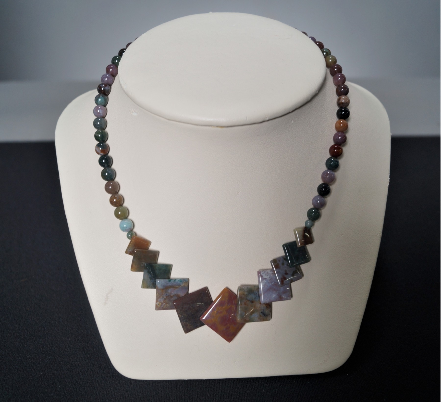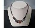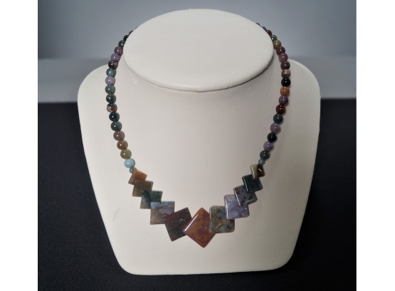 Listed is a beautiful stone necklace comprised of both flat and round colored stones. It measures 18.5" in length and is in very good condition.