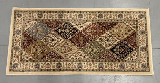 A rectangular rug with an intricate pattern featuring a cream background and multicolored diamond shapes. The rug has a border with floral motifs. It measures approximately 41" x 24".