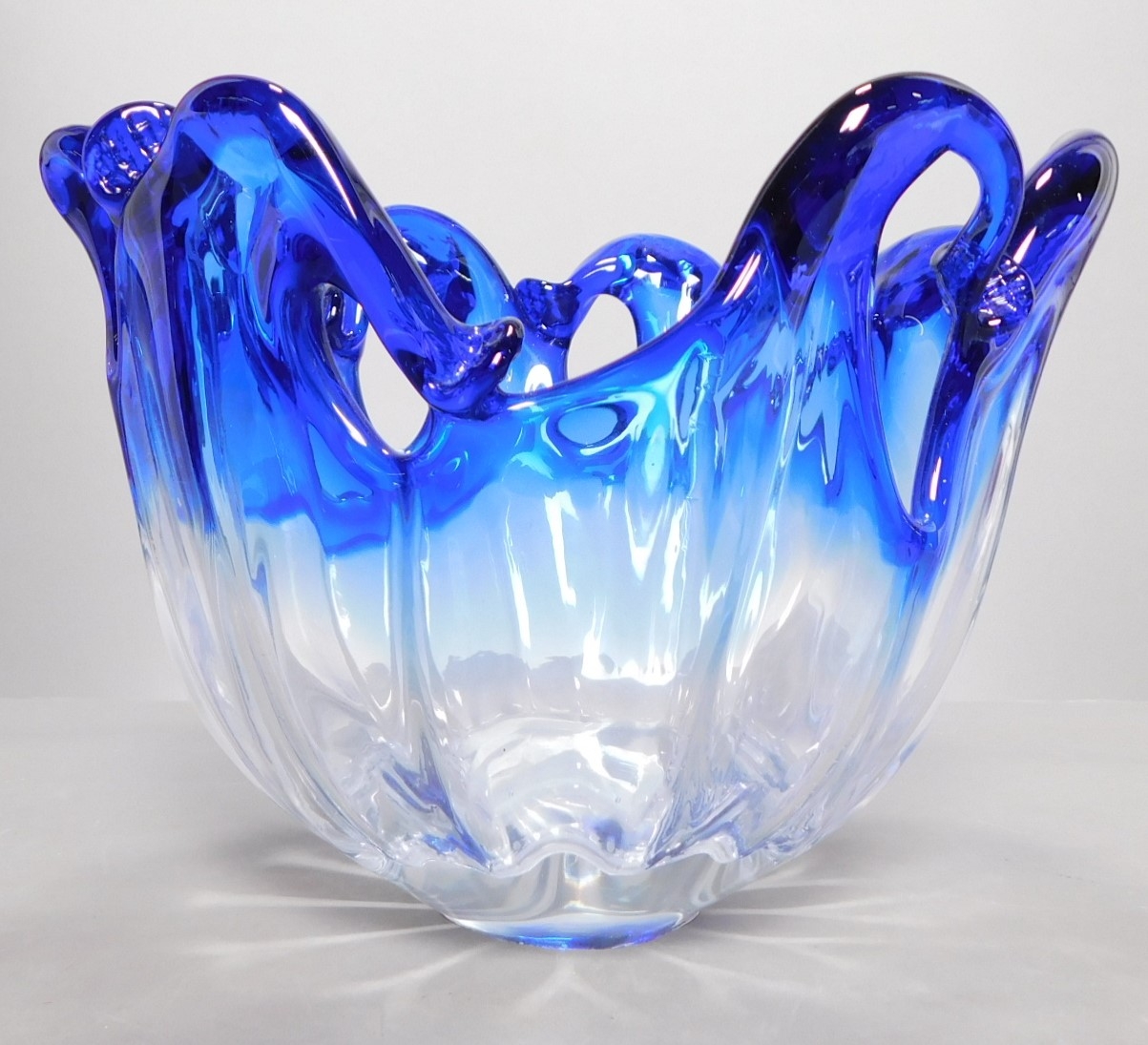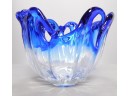 Clear design on the bottom. Blue, wavy design on top. This vase was hand made in Italy. It weighs 5 pounds. No chips. Beautiful piece!