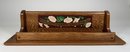 Oak wall shelf with painted floral and text decoration. Dimensions: 30 x 10 inches.