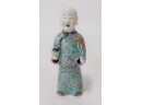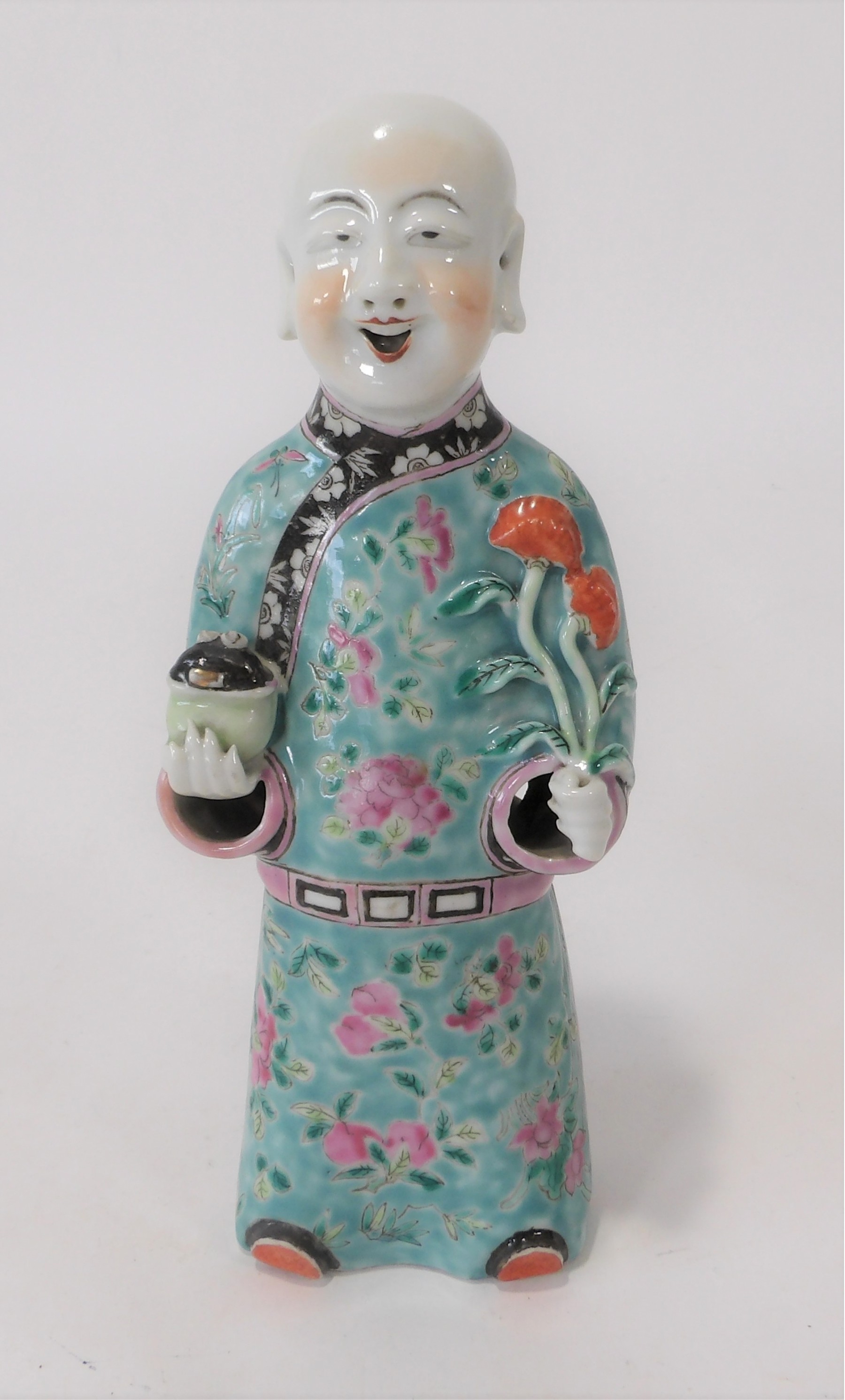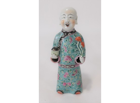 Elegantly dressed Asian man holding lotus flowers in one hand and a vessel of sorts in the other hand.