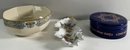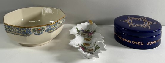 This lot features a porcelain bowl with floral and geometric designs, a leaf-shaped dish with floral accents, and a blue ceramic box with a 'Happy Hanukkah' inscription. Dimensions are approximately 3.25'' x 8'' (porcelain bowl), (leaf shape dish) 0.5'' x 10.5'', and (blue box) 2.5'' x 5.5''.