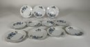 Set of twenty-five porcelain saucers with delicate blue floral motif and gold trim. Marked on the underside with the maker's mark: MZ Aurichlau GMR Czechoslovakia. Measures approximately 6 inches and 5 inches in diameter.