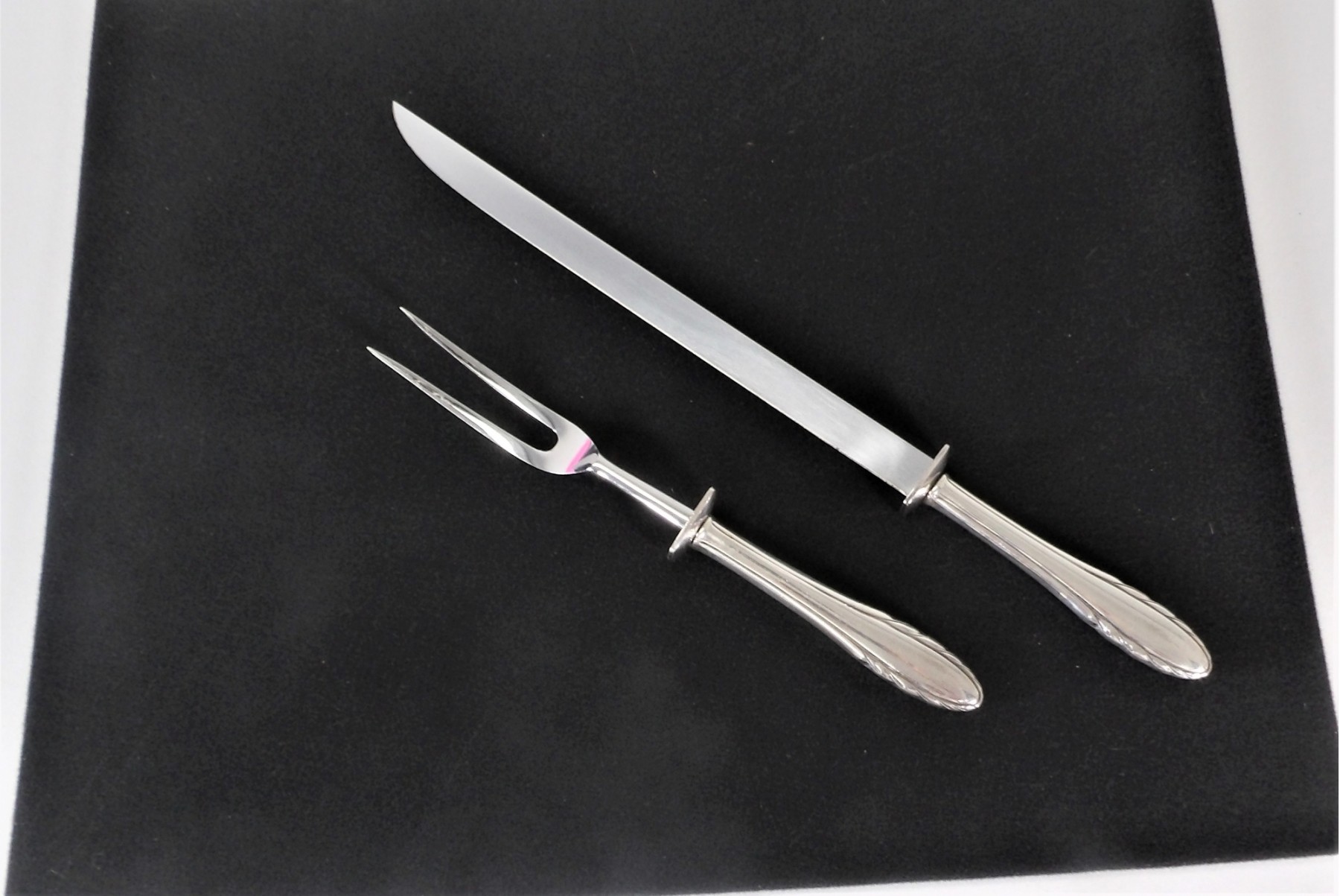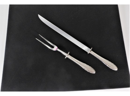 Listed is a beautiful carving set by Gorham. The knife measures 16.5". The blade is by Gerber. There is a tiny black mark on one side of the handle, otherwise in very good condition. The fork measures 11" long. Like the knife, the handle is sterling and is in very good condition. See photos for details.